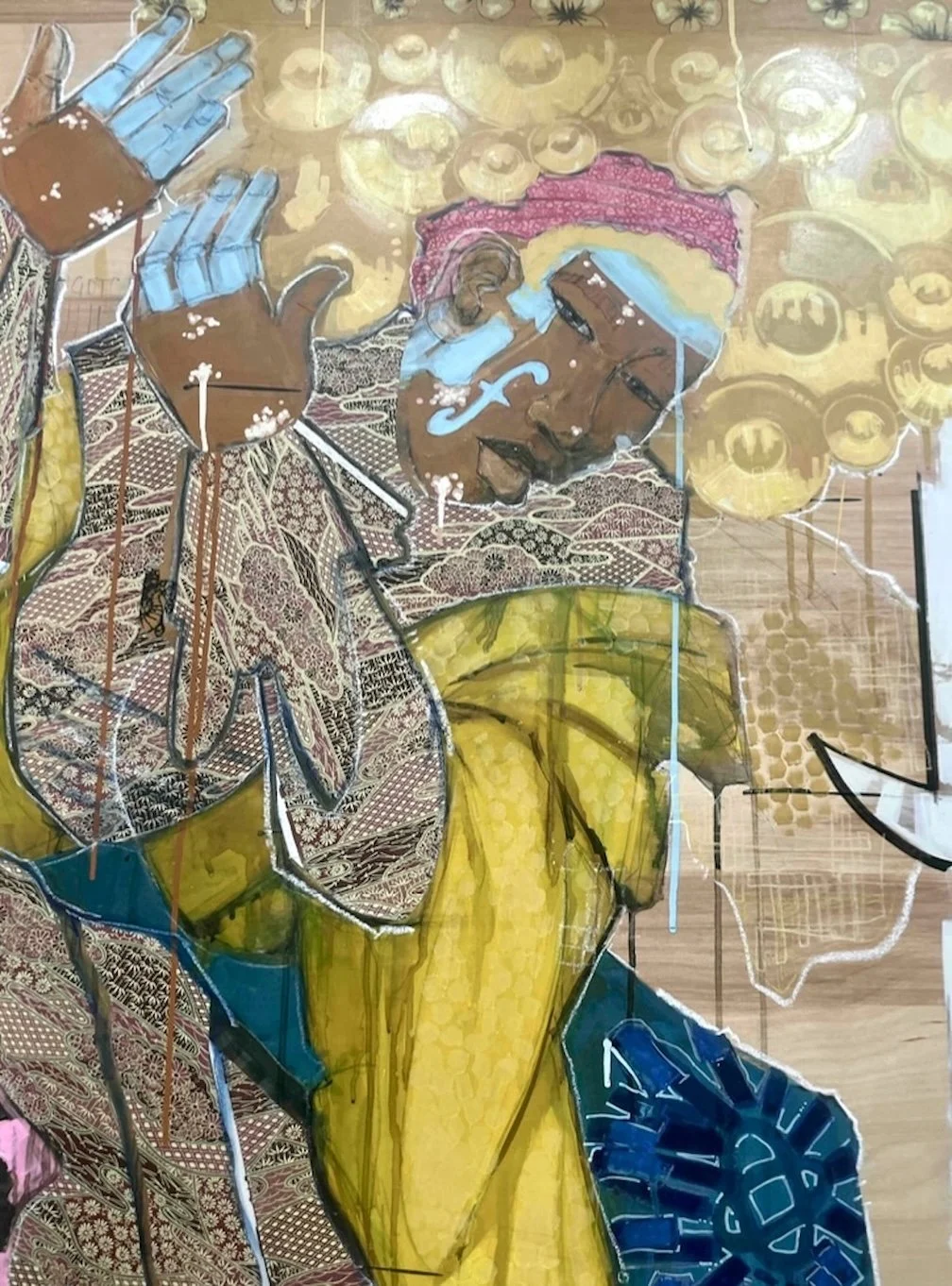 The paintings of the last decade feature embracing couples, each assigned to their cozy atmosphere (sometimes referred to as a pod). Luxury accessories like strands of pearls and oversized gold jewelry are collaged throughout the compositions, as are walls of speakers. From a series loosely called “All I Ever Wanted . . . (My God . . . my man!),” inspired by the Lenny Kravitz/SeanTaro Ono Lennon tune “All I Ever Wanted,” most of the works are titled with an accompanying haiku as well scripture from The Song of Songs.